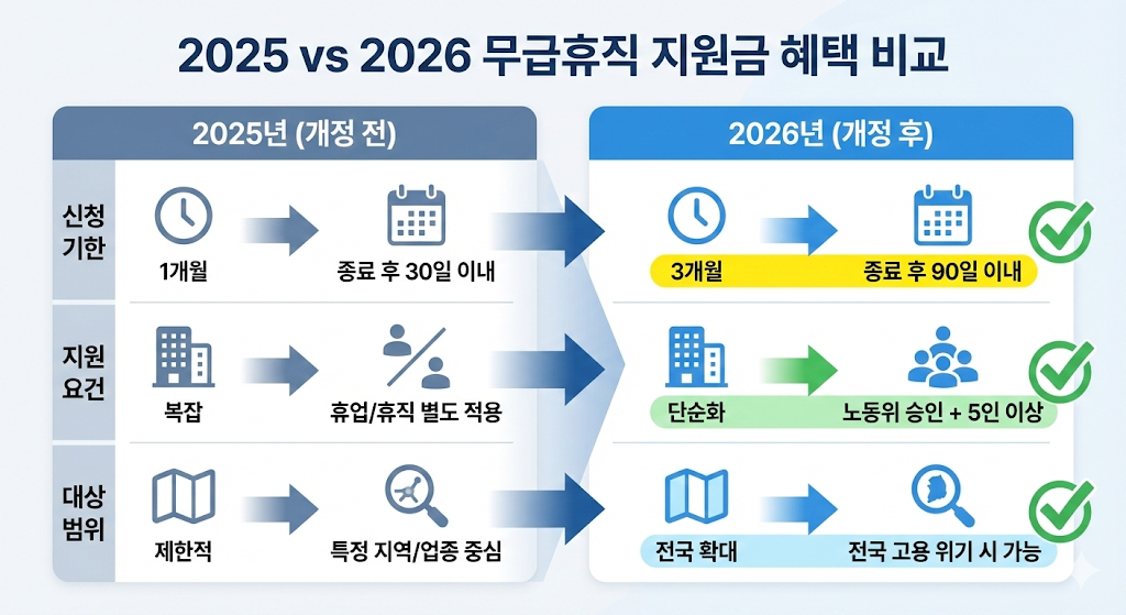 기존에는 휴업과 휴직의 기준이 달라 혼선이 많았습니다. 2026년부터는 무급 고용유지조치 시 노동위원회의 승인을 받고 5인 이상이 참여한다면 동일한 기준으로 지원을 받을 수 있도록 문턱이 낮아졌습니다.